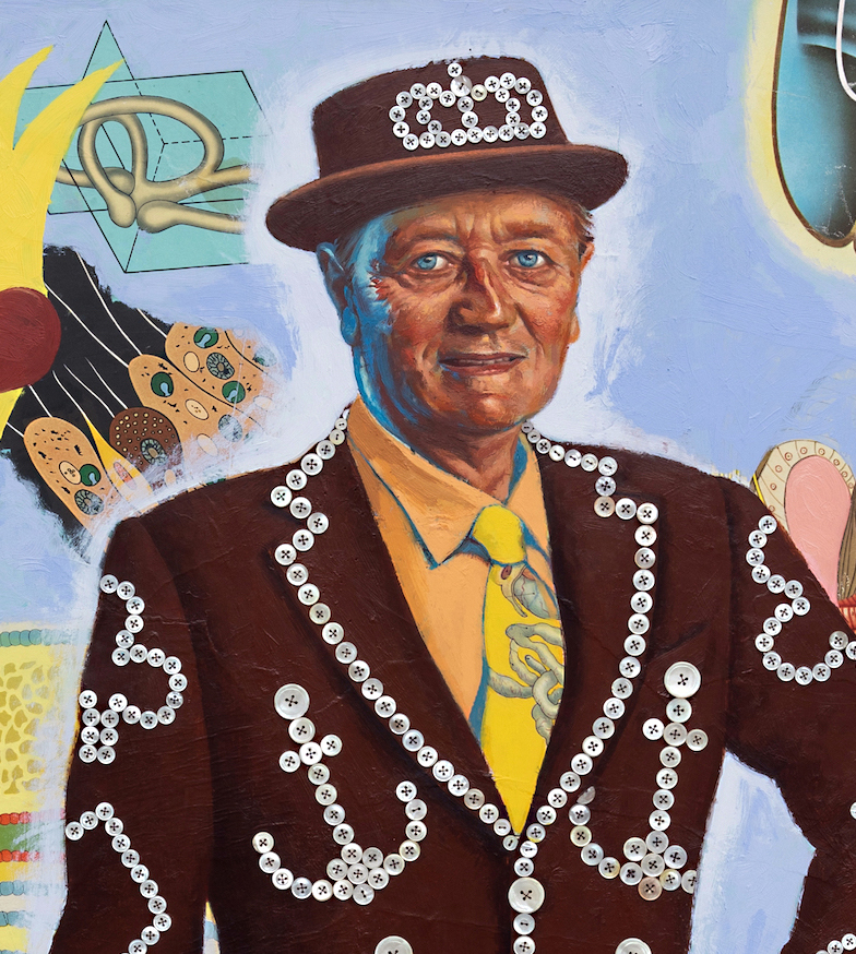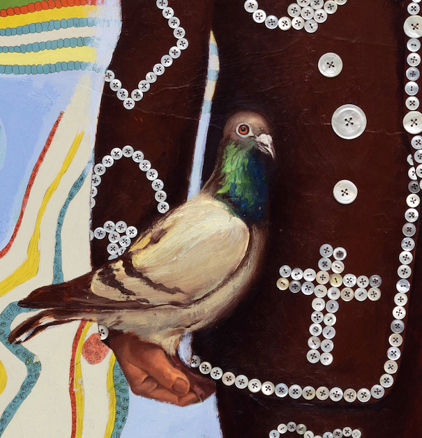 ‘The Pearly King of Pigeons’ 2019 oil and mother of pearl buttons on canvas 57.5 x 49.5 inches
