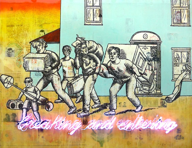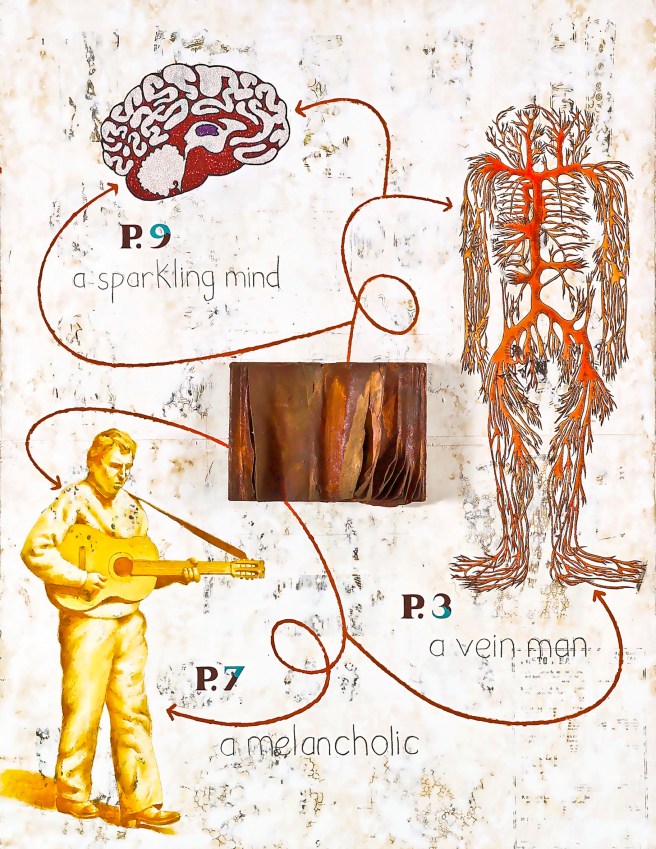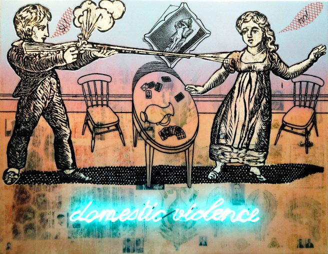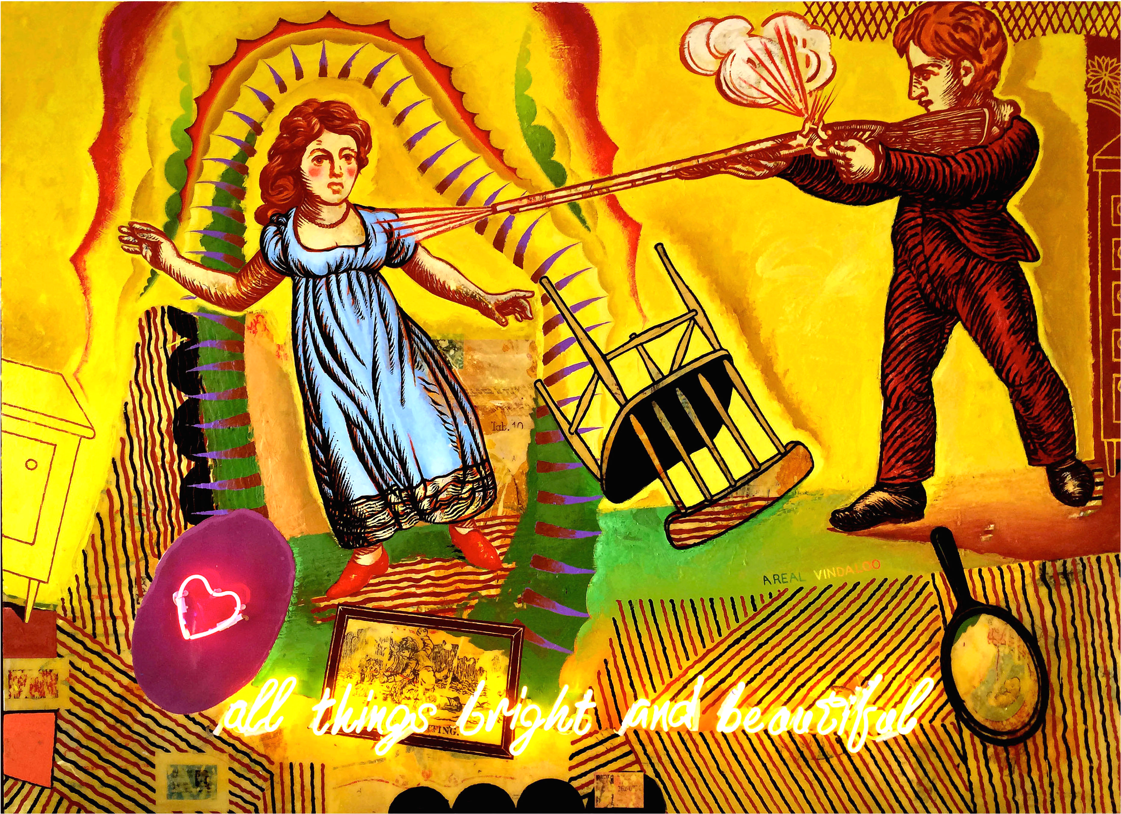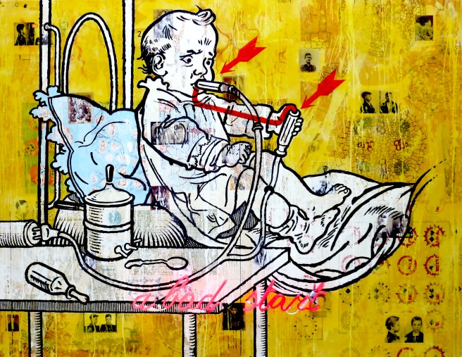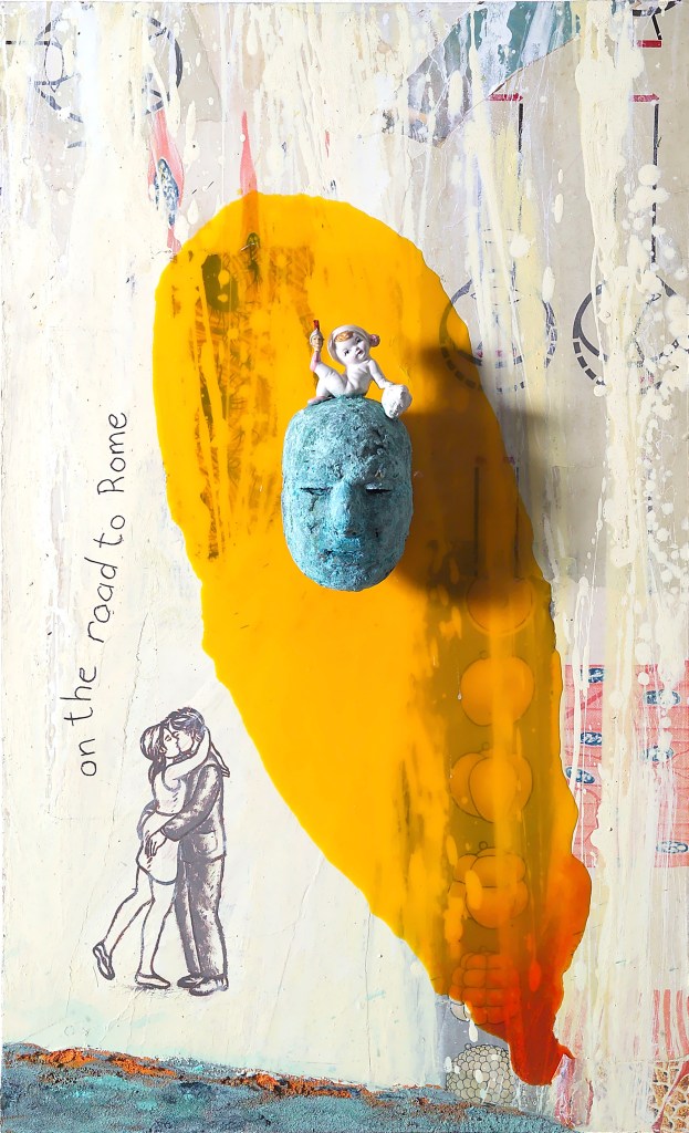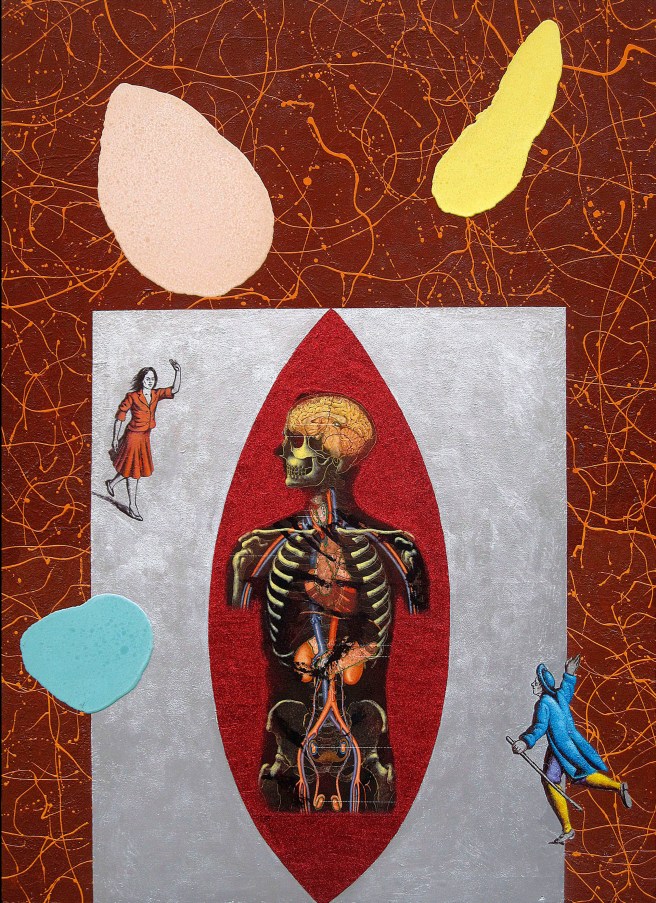 Detail from ‘Heart on His Sleeve‘ oil on canvas, appliqué, and mixed media on canvas.